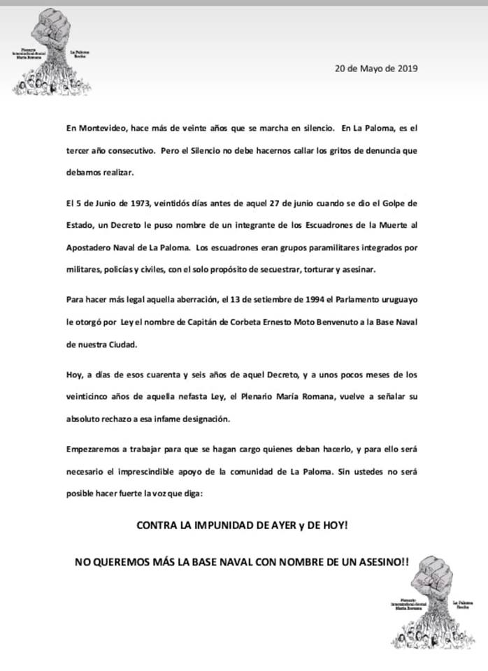 A través de un comunicado, el Plenario Intersindical-Social María Romana, de La Paloma, expresó su enérgico rechazo al decreto del 13 de setiembre de 1994 en el que el Parlamento uruguayo le otorgó por Ley el nombre de Capitán de Corbeta Ernesto Moto Benvenuto a la Base Naval de nuestra Ciudad. Además, pidió el apoyo de la comunidad “contra la impunidad de ayer y de hoy”.