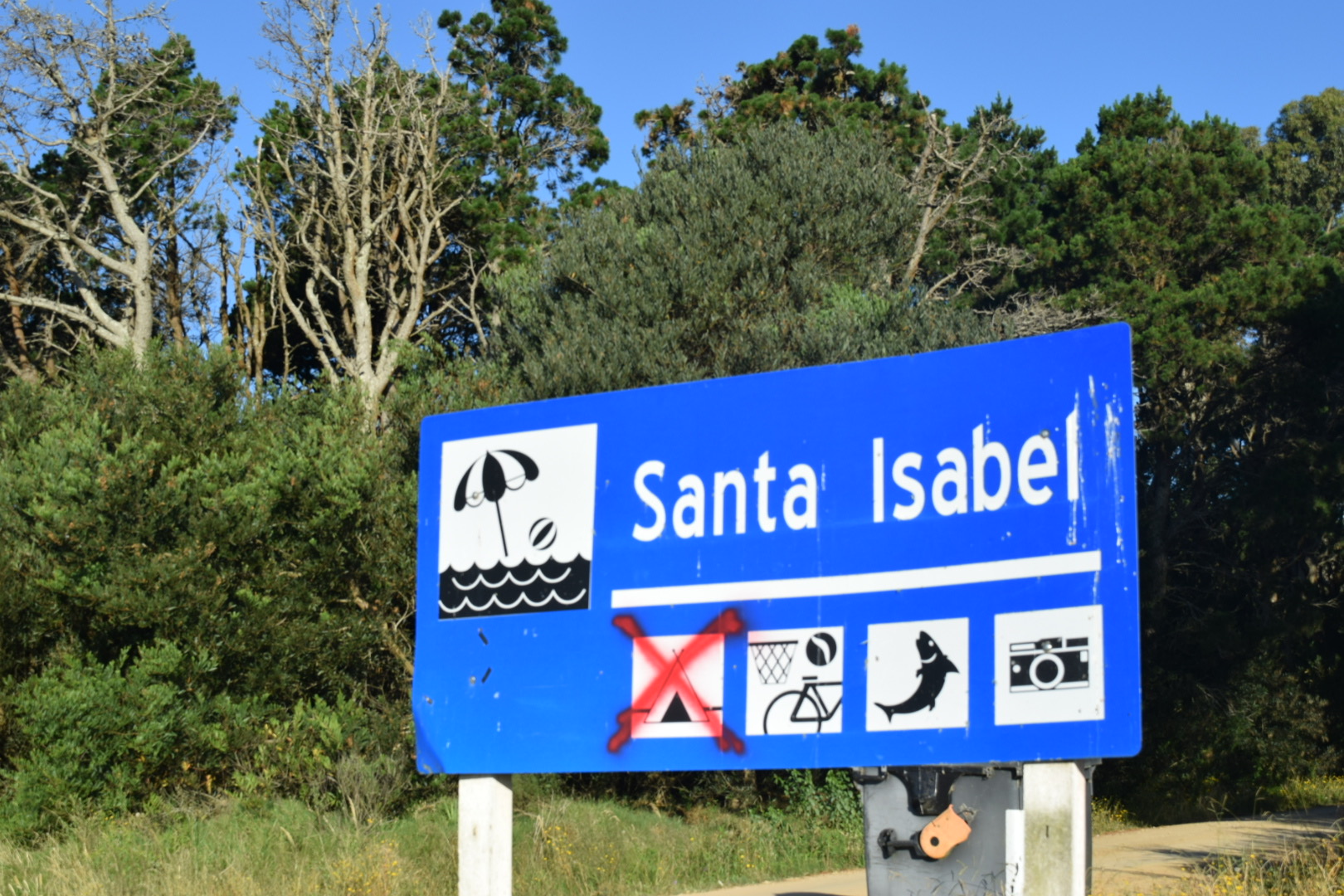 Aquel cartel que daba la bienvenida a quienen llegan a La Santa, como le dicen los locales, a acampar, fue intervenido, ahora la carpa dibujada fue tachada.