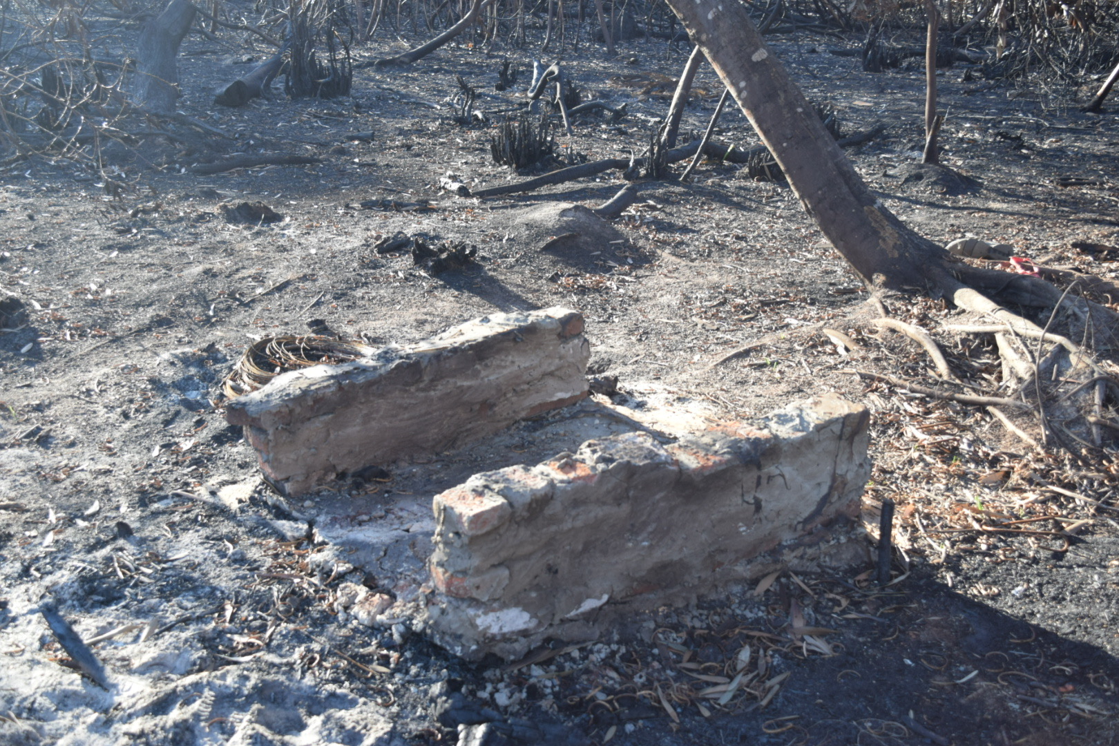 A unos pocos pasos, cuatro aros parecen esperan la lona de la carpa que se extinguió, dos termos carbonizados, dos calderas, championes y tazas de té quebradas que el fuego no aniquiló, completan la escena. Más lejos, pero no mucho, un parrillero improvisado marca el final de los testigos que no hablan, pero cuentan.