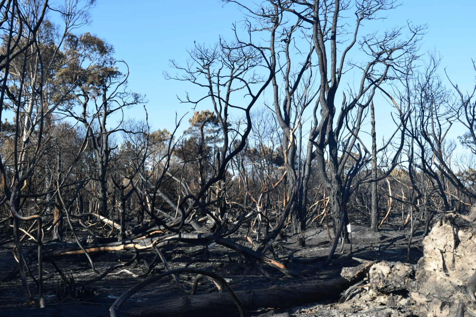 El olor que dejó el incendio del martes 10 de diciembre se hace sentir, y la brisa marina sacude la resina de los pinos que sobrevivieron, contrarrestando la sensación de desolación que persiste en el lugar.