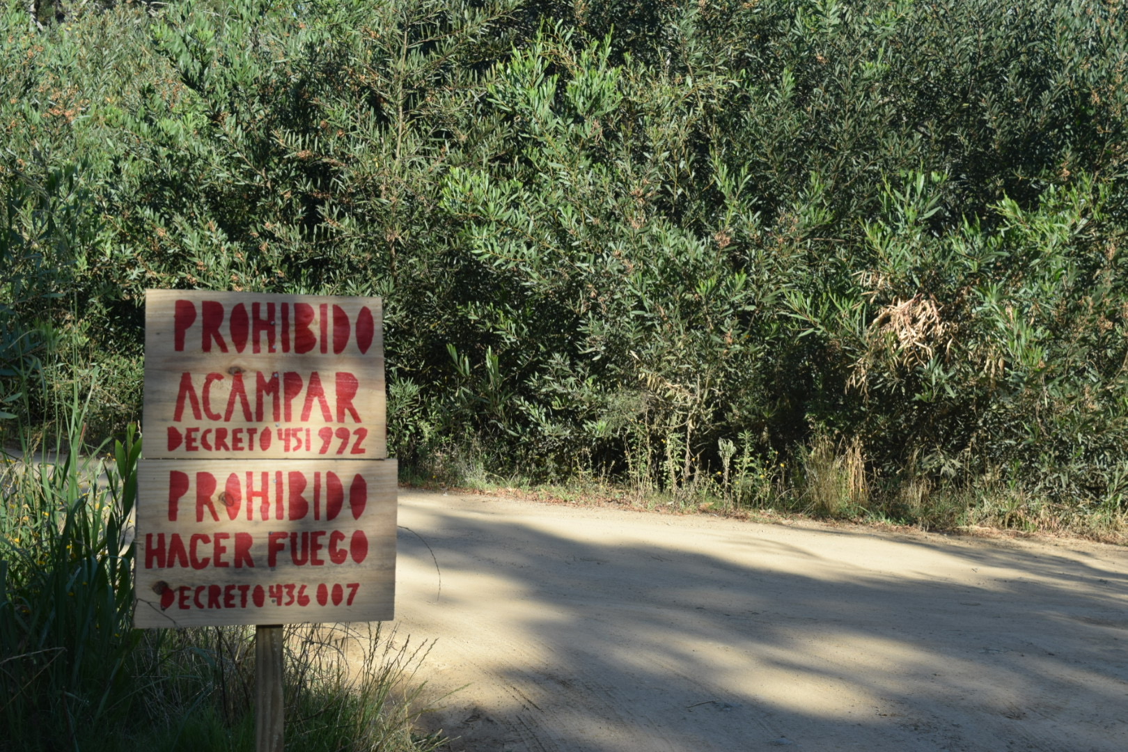 En la misma línea, y también en la segunda entrada, ya se puede ver la intención actualizada de los habitantes. Los carteles en madera, clavados en la calle de tierra no dejan lugar a dudas: “Prohibido acampar”, “Prohibido hacer fuego”, llevan escrito en letras rojas pintadas prolijamente a mano, y hacen referencia a los Decretos 451992 y 436007 respectivamente, que, evidentemente hasta ahora, pasaban desapercibidos.
