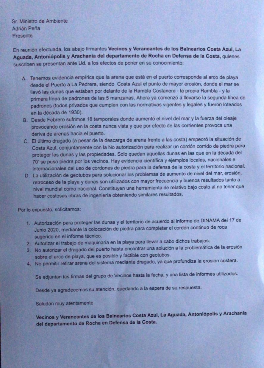 Los vecinos solicitan a través de la nota, autorización para la colocación de piedras para completar el cordón contenido de rocas, lo que harían mediante el trabajo de maquinaria en la zona de playa, para lo que también piden autorización al Ministerio.