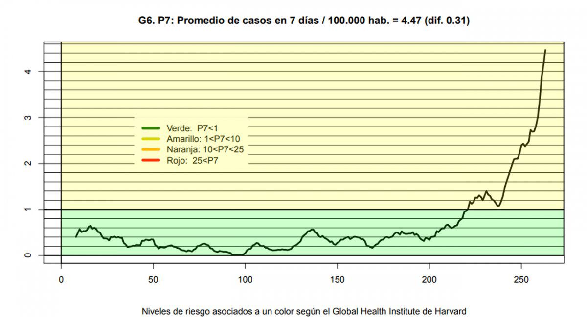 El gobierno difundió una gráfica con el aumento de casos de Covid-19, y se explicó que pasar del riesgo amarillo al naranja implica superar los 350 casos diarios en una semana. Pasar del naranja al rojo implica superar los 900 casos diarios en una semana. En los últimos días hubo picos de 208 casos diarios y un promedio arriba de 100.
