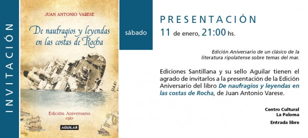 Sin dudas estamos hablando de un clásico de la literatura rioplatense en temas del mar, es por eso que Ediciones Santillana y su sello Aguilar invitan a la presentación de la edición Aniversario del libro "De naufragios y leyendas en las cotsas de Rocha", de Juan Antonio Varese. Por tal motivo, el autor nos cuenta que "La primera edición apareció en diciembre de 1993 y desde entonces han cambiado muchas cosas en el mundo, de eso y otras tantas cosas, de nuevos naufragios y antiguas historias, hablaremos la noche del sábado."