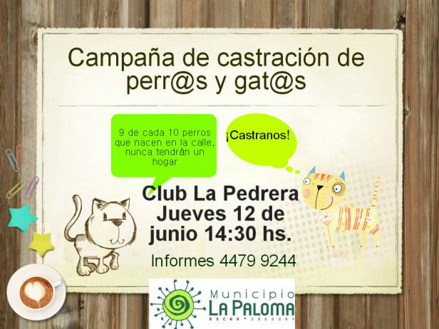 El Municipio de La paloma informa que el próximo JUEVES 12 DE JUNIO desde las 14:30, se realizarán castraciones de perr@s y gat@s en el Club Social La Pedrera. La misma tien un costo de $300. Deben anotarse llamando al 44796960 o 44796082 con Karina, de lunes a viernes en el horario de 11 a 16 horas. Colaboremos juntos para controlar la población animal en La Paloma Grande.