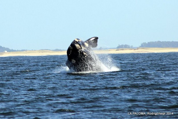 Adriana Pugliese/// Sin dudas este martes 30 de setiembre quedará en la retina de los visitantes y residentes de La Paloma. Como ya hemos informado, entre los meses de agosto y noviembre, nuestras costas son visitadas por ejemplares de ballena franca Austral, sin embargo la temporada de avistajes venía concurrida, pero tranquila. Este martes salimos con el equipo de La Paloma Hoy a “peinar” las aguas con la vista en busca de algún soplido, un coletazo, o alguna señal que nos indicara que ellas estaban ahí. Apenas llegamos a playa Anaconda, vimos un soplido a lo lejos, hacia el lado de Playa Los Botes. Por ese motivo nos corrimos hacia aquella zona, esperando mejorar nuestra posición. ¡Y claro que lo hicimos! El mejor lugar parecía ser El Cabito, entre los médanos más altos de la zona. Allí bajamos. Fue cuestión de sentarse, aprontar el mate y empezar a ver un desfile de ballenas, que después nos enteraríamos que no fue nada usual. En el Facebook de la RED de AVISTAJE BALLENAS Francas, y en BALLENAS DE LA PEDRERA, se sucedían los mensajes avisando del show que mostraban, no lejos de la costa, un grupo compuesto por entre tres y cinco ballenas. Después se sumarían otras, y aparecería en escena el gomón de la OCC (Organización para la Conservación de Cetáceos) comandado por Rodrigo García, quien más tarde subió a las redes sociales las imágenes del impactante momento, que tildó de “indescriptible”: “de esos que suceden pocas veces en la vida con las ballenas”…”el mejor momento de la temporada que hemos vivido!! 4 horas con ellas”, aún emocionado por la mañana de trabajo que se le había presentado. Luego se refirió a la imagen principal que ilusta esta nota como "el salto final más maravilloso que he vivenciado en 15 años y fue en La Paloma, Uruguay... no hay que viajar 1800km para vivirlo."