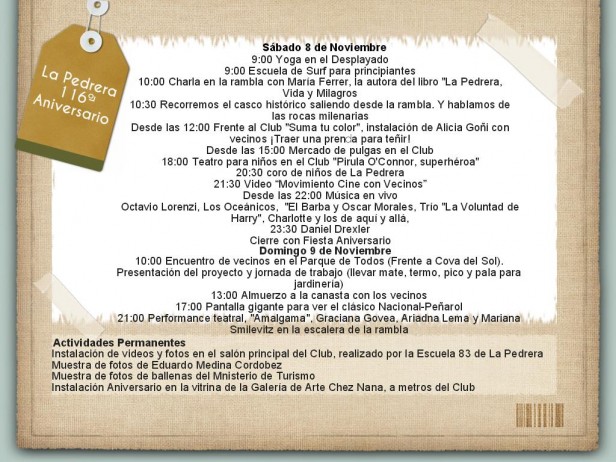Sábado 8 de Noviembre 9:00 Yoga en el Desplayado 9:00 Escuela de Surf para principiantes 10:00 Charla en la rambla con María Ferrer, la autora del libro "La Pedrera, Vida y Milagros 10:30 Recorremos el casco histórico saliendo desde la rambla. Y hablamos de las rocas milenarias Desde las 12:00 Frente al Club "Suma tu color", instalación de Alicia Goñi con vecinos ¡Traer una prensa para teñir!  Desde las 15:00 Mercado de pulgas en el Club  18:00 Teatro para niños en el Club 20:30 coro de niños de La Pedrera 21:30 Video “Movimiento Cine con Vecinos”  Desde las 22:00 Música en vivo Octavio Lorenzi, Los Oceánicos,  "El Barba y Oscar Morales, Trío "La Voluntad de Harry", Charlotte y los de aquí y allá,  23:30 Daniel Drexler Cierre con Fiesta Aniversario   Domingo 9 de noviembre   10:00 Encuentro de vecinos en el Parque de Todos (Frente a Cova del Sol). Presentación del proyecto y jornada de trabajo (llevar mate, termo, pico y pala para jardinería) 13:00 Almuerzo a la canasta con los vecinos 17:00 Pantalla gigante para ver el clásico Nacional-Peñarol 21:00 Teatro improvisación en la escalera de la rambla   ACTIVIDADES PERMANENTES: Instalación de videos y fotos en el salón principal del Club, realizado por la Escuela 83 de La Pedrera Muestra de fotos de Eduardo Medina Cordobez Muestra de fotos de ballenas del Mnisterio de Turismo Instalación Aniversario en la vitrina de la Galería de Arte Chez Nana, a metros del Club