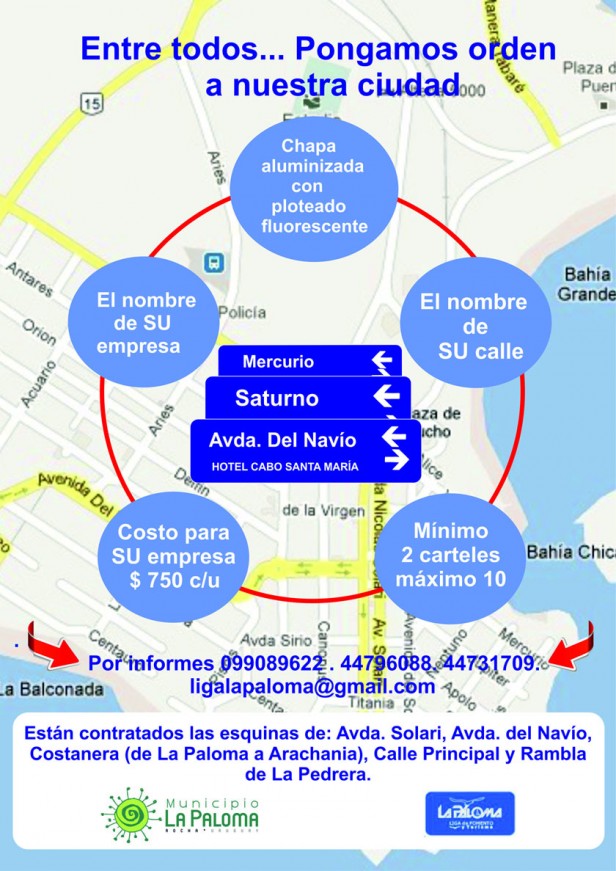 Los comercios y marcas interesadas en figurar en la cartelería deben consultar a la Liga de Fomento y Turismo, llamando a los siguientes teléfonos: 4479-6088. 4473-1709. 099 089 622 o enviando un mail a [email protected].