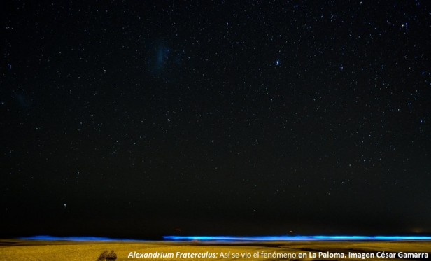 Noctiluca scintillans es el caso más típico pero no es el único. Desde hace unos 10 días se está registrando bioluminiscencia a lo largo de toda la costa de Rocha, desde La Paloma hasta Punta del Diablo; en algunos sitios más intensa y en otros más leve, "en este caso el responsable de esa bioluminiscencia es Alexandrium fraterculus, mismo responsable de teñir de rojo el agua en los sitios de mayor densidad. Agua roja en el día, fosforescente en la noche", explica Martínez, y aclara que "este dinoflagelado no es tóxico".