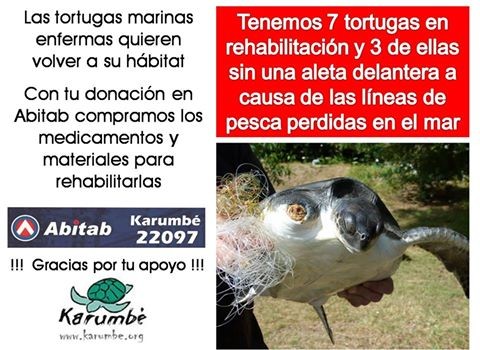 La ONG Karumbé con sede en La Coronilla, pide colaboración a quienes estén interesados en apoyar su trabajo en la rehabilitación de tortugas marinas con un mensaje en su página de Facebbok "10, 20, 30, 100 pesos, lo que puedas donar para que logremos la rehabilitación de las tortugas marinas. Vas a ABITAB a pagar una factura o recargar un celular??? Llevate anotada la cuenta 22097 de Karumbé. MIL GRACIAS", publicaron en su muro.