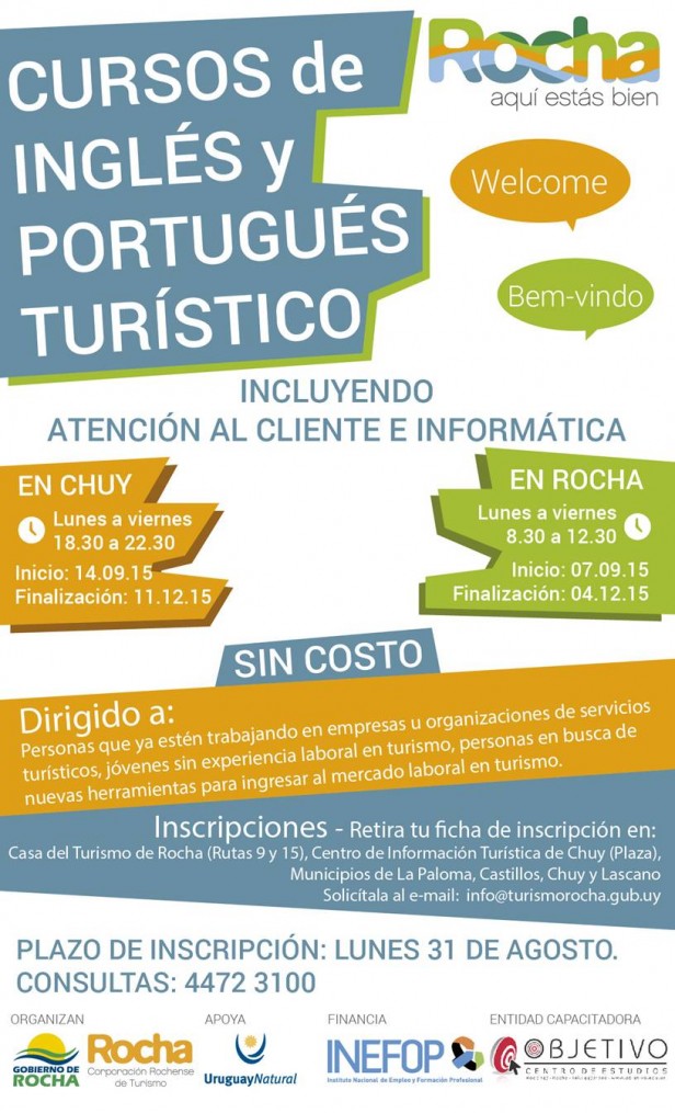 La Organización de Gestión de Destino (OGD) Rocha, con apoyo del Ministerio de Turismo e INEFOP y la entidad capacitadora local Objetivo, están ofreciendo cursos gratuitos de inglés y portugués turístico. Los mismo incluyen además Atención al Cliente, informática y Orientación Laboral.