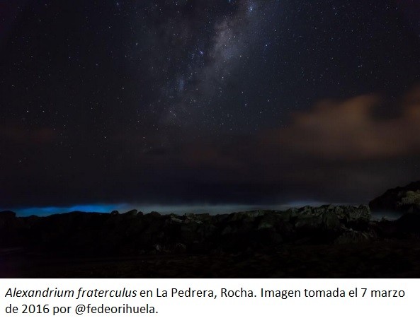 La creencia popular dio por sentado que se trataba de noctilucas. Pero no. Tal como ocurrió en marzo de 2015, el fenómeno consistió en un evento de similares características: "En este caso el responsable de esa bioluminiscencia es Alexandrium fraterculus, mismo responsable de teñir de rojo el agua en los sitios de mayor densidad. Agua roja en el día, fosforescente en la noche", así lo explicó a La Paloma Hoy la Licenciada Ana Martínez, de la Dirección Nacional de Recursos Acuáticos con base en La Paloma, quien aclaró también que "este dinoflagelado no es tóxico".