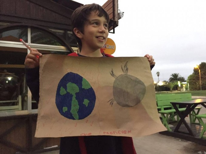 “Un día agarré una cartulina y dibujé un mundo contaminado, y el otro todo natural - cuenta Juampe a La Paloma Hoy- entonces, fui al supermercado EL Dorado con un marcador rojo para preguntarle a la gente en cuál de los dos querían vivir.”