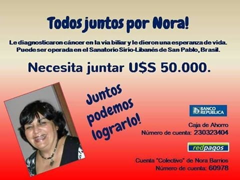 Nora es docente de historia y adscripta del Liceo La Paloma. En este momento está librando una dura batalla ya que le diagnosticaron cáncer en la vía biliar. En el Sanatorio Sirio-Libanés de San Pablo, Brasil, le dieron una esperanza de vida. Esa operación tuvo un costo de 50 mil dólares.