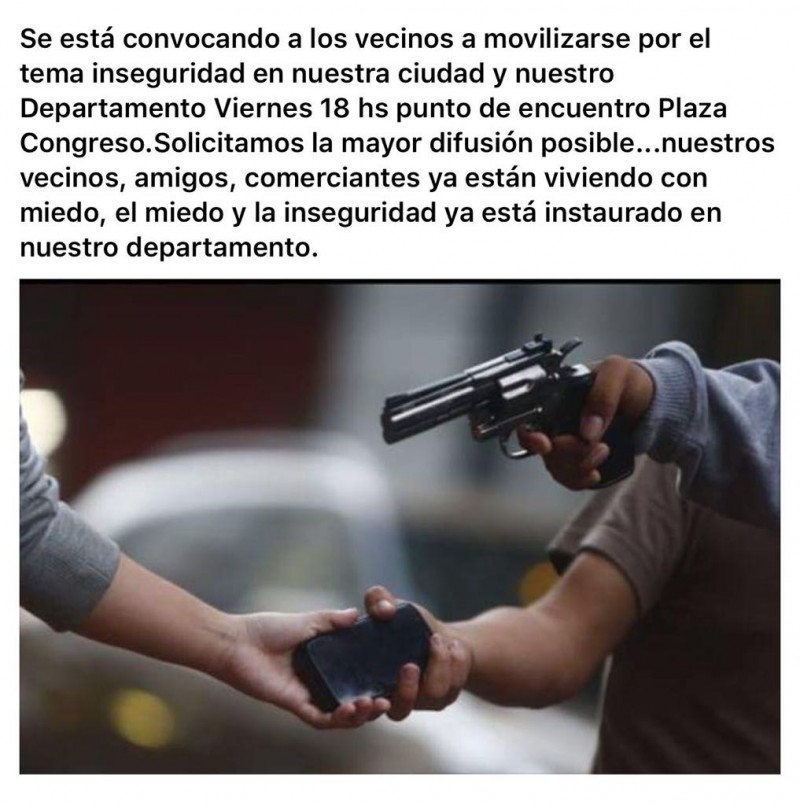 La convocatoria, que circula en las redes sociales, es para el próximo viernes 24 de noviembre a las 18 horas en la Plaza Congreso, ubicada en Batlle y Ordoñez esquina Lavalleja de la capital departamental. La convocatoria: "Se está convocando a los vecinos a movilizarse por el tema inseguridad en nuestra Ciudad y nuestro departamento (...) Nuestros vecinos, amigos, comerciantes, ya están viviendo con miedo. El miedo y la inseguridad ya están instaurados en nuestro departamento". En las últimas horas, una comerciante fue baleada por delincuentes que ingresaron con fines de robo a su local en la capital del departamento; hecho que, junto a otros similares, desencadenó en un reclamo masivo por mayores medidas por parte de las autoridades.