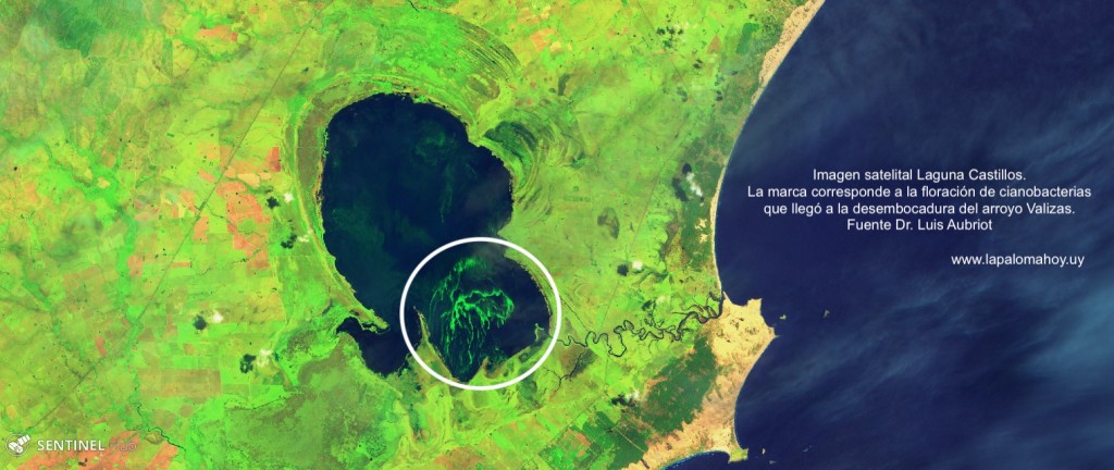 El miércoles se difundió, a través de redes sociales, una serie de imágenes del entorno del Arroyo Valizas, más precisamente en la desembocadura. Allí puede apreciarse claramente en la orilla el agua de color verde fluorescente. En las últimas horas, una imagen satelital muestra el foco inicial del problema: la Laguna de Castillos -que desemboca en el Océano a través del arroyo Valizas, está -en parte- con manchas verdes, producto de las floraciones.