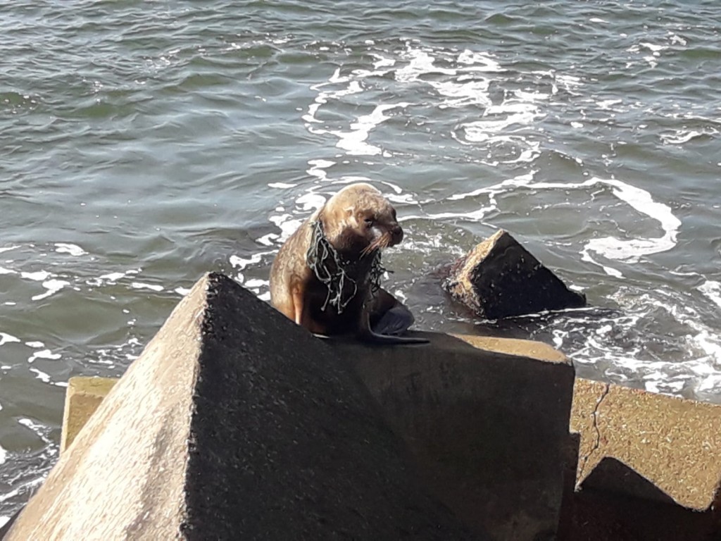 Un lobo marino fino apareció el pasado viernes en la escollera de La Paloma. Hasta ahí, es una situación habitual y festejada por quienes logran verlos en su hábitat. Sin embargo, este tenía un problema visible:  algo le rodeaba el cuello y lo tenía incómodo.