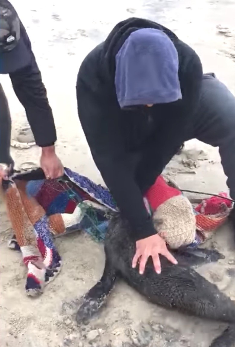 El pasado lunes 22 de junio en Playa La Aguada, Leandro y Agustín lograron ayudar a un lobito marino que estaba en apuros, ya que tenía una red de pesca que le rodeaba el cuello. Para poder cortar la red, lo atraparon mientras estaba en la playa con un trapo y, con la ayuda de un cuchillo, entre ambos cortaron lo que apretaba el cuello del animal.