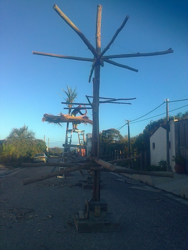Con solo pasear por la Avenida Principal se pueden apreciar las tres torres o tótems dispuestos en el medio de la callle lateral del Club. Bases de cemento, y el resto bien inflamable, paja, madera, telas... y todo lo que ayude a que arda varios minutos frente a los ojos de los presentes. Cada vecino que lo desee podrá aportar su elemento para la fogata y apreciar las ofrendas abrazadas por el fuego hasta consumirse.