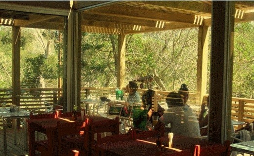 Servicio de platos típicos de la zona, y Té. La carta está basada en platos que combinan lo típico del Uruguay, (carnes vacunas y ovinas), con productos del departamento de Rocha, (jabalí, cangrejo sirí, pescados, mariscos, butiá, ñandú, liebre, miel, etc.) y de producción propia, en establecimientos próximos a la reserva como los derivados de la leche de cabra, verduras y hortalizas de la huerta orgánica.