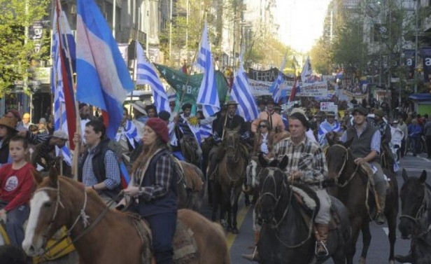La Asamblea Ambiental Permanente en Defensa de la Tierra, el Agua y los Bienes Naturales (que está integrada por más de 45 organizaciones sociales de todo el país) realizó el viernes 18 de octubre, su 5ª marcha con el foco en el rechazo a la minera Aratirí, la regasificadora y el puerto de aguas profundas. La movilización, que congregó a miles de personas, se realizó por la Avenida 18 de Julio desde el Obelisco hasta la Plaza Independencia, donde se leyó una proclama. De la marcha -que fue convocada por varios sindicatos como ADES, Afutu, Adeom y la FEUU- participaron personas de todas las edades y provenientes de varios departamentos. Una importante cantidad de manifestantes se trasladaban a caballo. También se vieron pancartas con consignas ambientalistas y con críticas al presidente José Mujica.