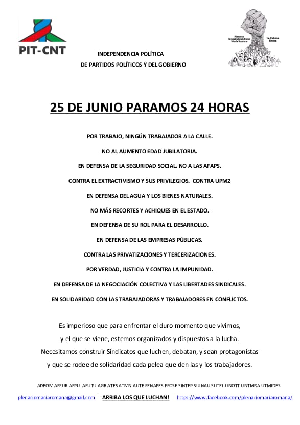 El plenario Intersindical-Social María Romana, realizará una concentración a partir de las 10 horas frente al monumento a Artigas, en Av. Solari y Paloma. A las 11:30 partirá desde allí la movilización.