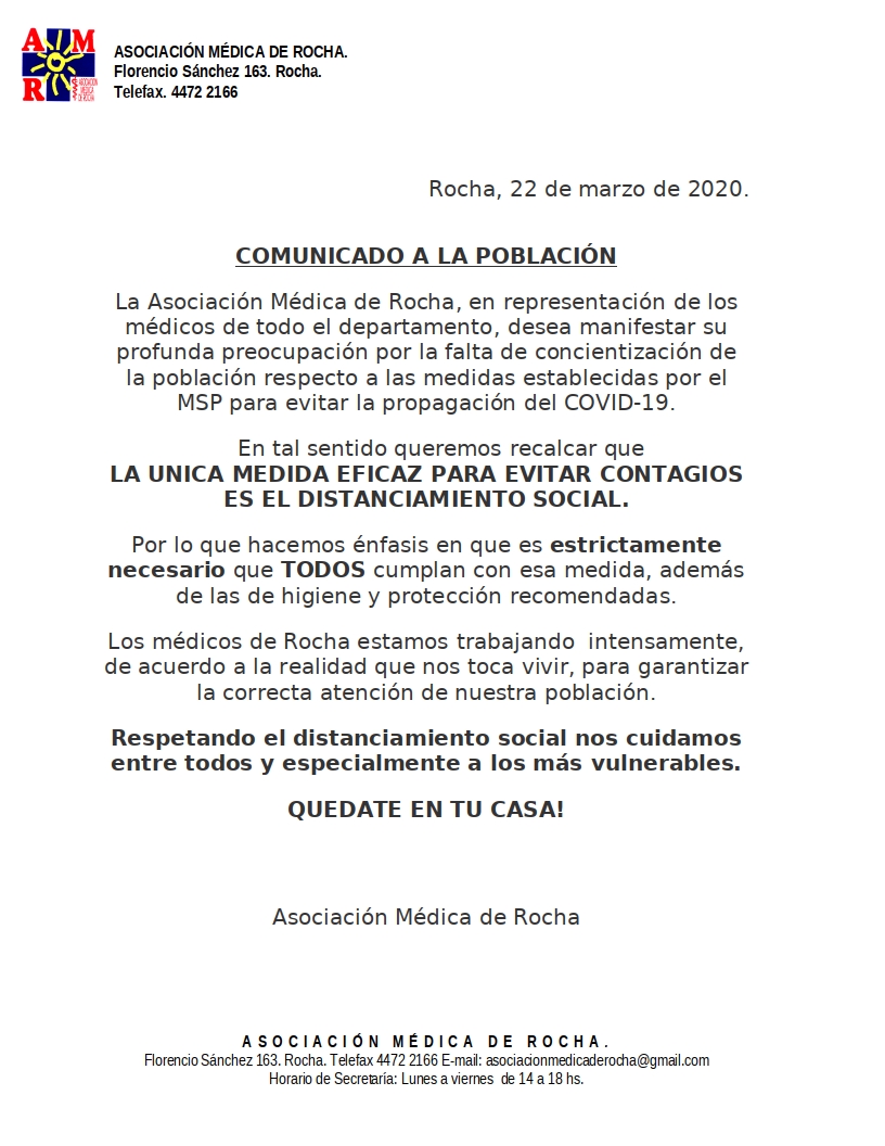La Asociación Médica de Rocha manifestó a través de un comunicado difundido esta mañana, su profunda preocupación por la falta de concientización de la población respecto a las medidas adoptadas por el MSP para evitar la propagación del Covid 19.