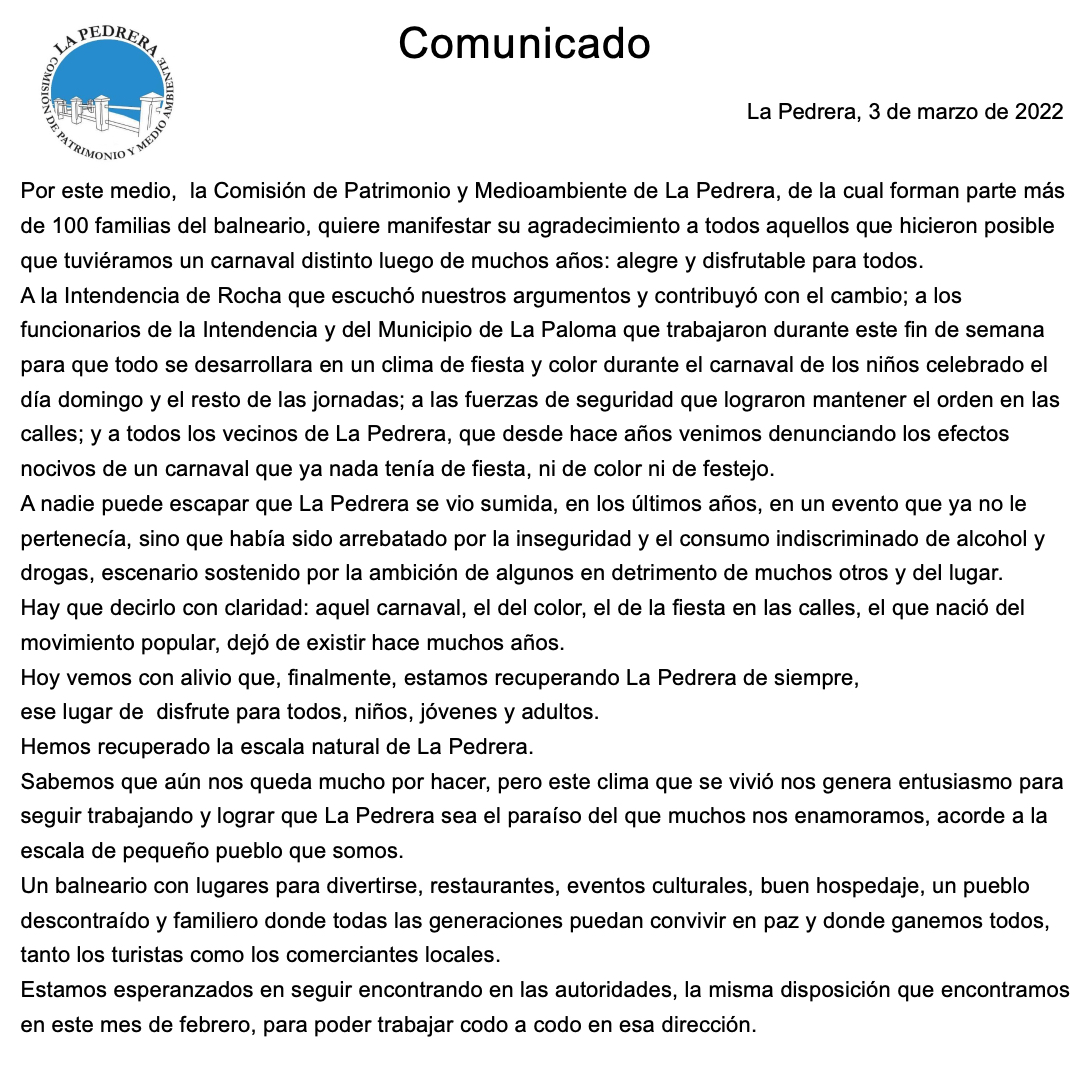 La Comisión de Patrimonio y medioambiente de La Pedrera, manifestó a través de un comunicado, su satisfacción con el desarrollo del fin de semana de carnaval en el balneario y expresó su agradecimiento a aquellos "que hicieron posible que tuviéramos un carnaval distinto luego de muchos años: alegre y disfrutable para todos".