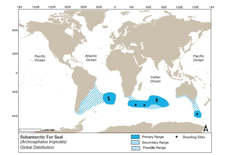 Mapa de distribución del Lobo subantártico (Arctocephalus tropicalis)