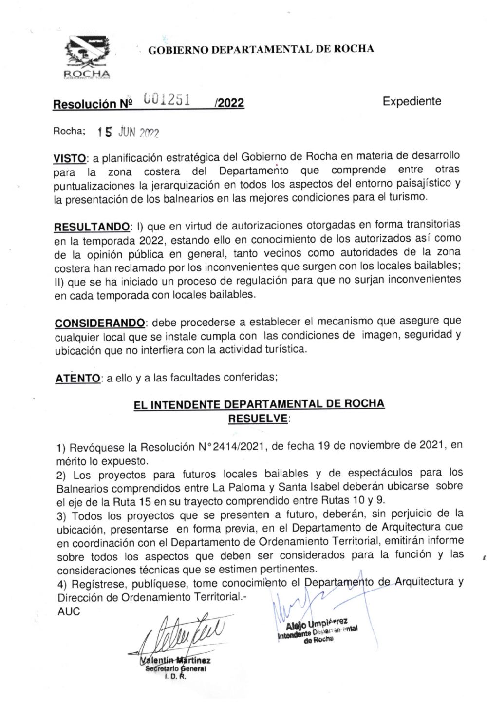 La Justicia determinó, en las últimas horas, que la Resolución 1251 que firmó el intendente Alejo Umpiérrez el 15 de junio de 2022, segúnn la cual “los proyectos para futuros locales bailables y de espectáculos para los balnearios comprendidos entre La Paloma y Santa Isabel -esto incluye La Pedrera- deberán ubicarse sobre el eje de la ruta 15 en su trayecto comprendido entre las rutas 10 y 9", tiene absoluta vigencia y deberá ser cumplida.