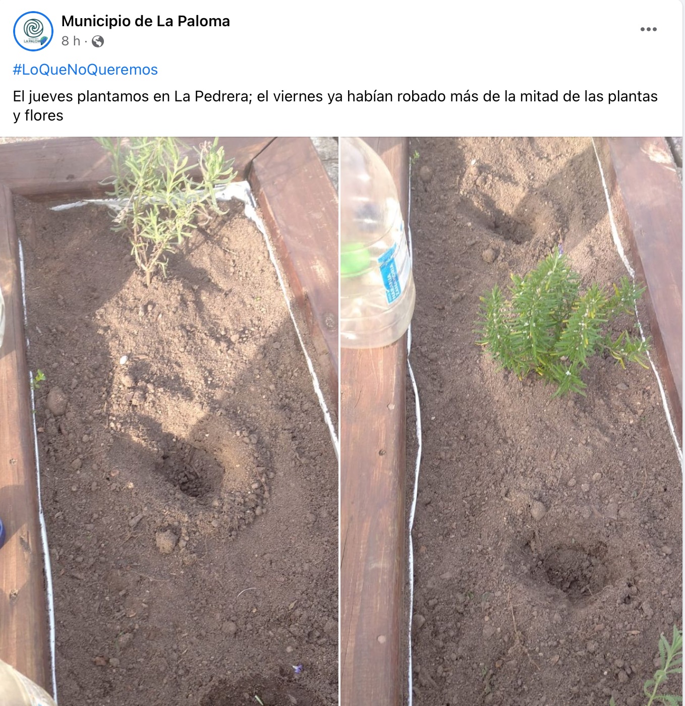 Vandalismo Así mismo, el Municipio informó que la semana pasada se había realizado una jornada de plantación de distintas plantas ornamentales en los canteros de la Avenida Principal de La Pedrera. Esta tarea, se había hecho en coordinación con la Escuela 83 del pueblo, y los niños que concurren al establecimiento pudieron plantar ellos mismos las flores que adornan sus calles.