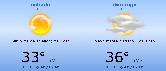El domingo estará mayormente nublado y caluroso. Por la noche Claro a parcialmente nublado, cálido y húmedo. Mínima de 23º y máxima de 36º. Atención porque se espera una sensación térmica de 41º.