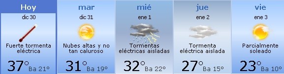 Jueves: Tormenta eléctrica en la zona en la mañana; nublado, con brisa, no tan cálido. Por la noche mucha nubosidad. Mínima de 15º y máxima de 27º.