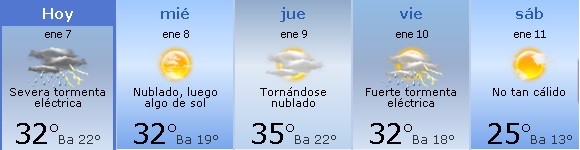 Martes: Severa tormenta eléctrica más tarde; chaparrón o tormenta eléctrica temprano, mayormente nublado. Algunas tormentas eléctricas fuertes al anochecer; nublado, cálido y húmedo. Mínima de 22º y máxima de 32º.