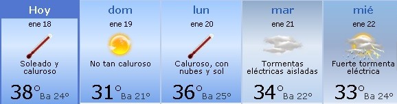 Sábado 18: Soleado y caluroso anormal para la época. Por la noche cielo claro con clima muy cálido. Mínima de 24º y máxima de 38º.