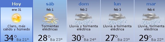 Domingo 2: Húmedo, con lluvia y tormenta eléctrica. Por la noche fuertes lluvias y tormenta eléctrica; cálido y húmedo. Mínima de 24º y máxima de 30º.
