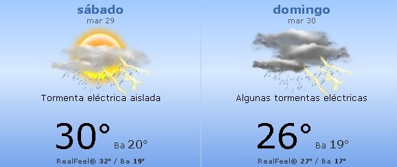 EL sábado se presenta con posibilidad de tormenta eléctrica en la zona en la mañana, por otra parte parcialmente soleado, cálido y húmedo. Por la noche cálido y húmedo con nubes. Mínima de 20º y máxima de 30º. El domingo estará húmedo; algunos chaparrones temprano, luego algunas tormentas eléctricas, ventoso. Por la noche húmedo; algunas tormentas eléctricas temprano, luego no se descarta la probabilidad de un chaparrón. Mínima de 19º y máxima de 26º.