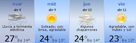 Martes 8: De mañana fuertes lluvias y tormenta eléctrica; húmedo, parcialmente soleado a la tarde. Por la noche claro y más fresco. Mínima de 14º y máxima de 27º.