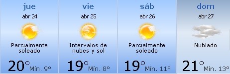 Jueves 24: Parcialmente soleado. Por las noches nubes bajas. Mínima de 9º y máxima de 20º.