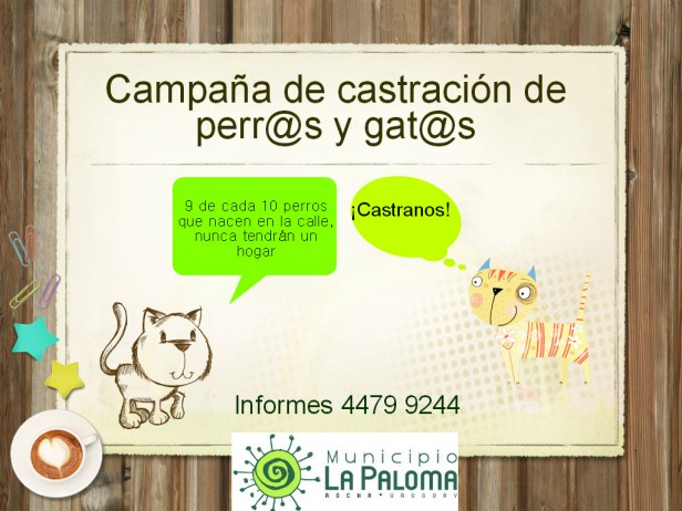 El Municipio de La paloma informa que en los próximos días se realizarán castraciones de perr@s y gat@s en la oficina administrativa, en calle Aries y Paloma. La misma tiene un costo de $300. Deben anotarse llamando al 44796960 o 44796082 con Karina, de lunes a viernes en el horario de 11 a 16 horas. Colaboremos juntos para controlar la población animal en La Paloma Grande.
