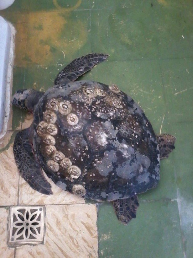 Pobre menos mal que la van a curar, me gustaria saber que tiene ensima de su caparazon aparte de los golpes, parecen bichos.-