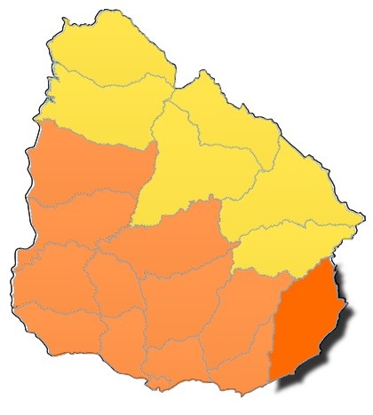 Según el informe, son 13 los departamentos afectados por la advertencia de este color: Paysandú, Río Negro, Soriano, Colonia, Durazno, Flores, San José, Montevideo, Canelones, Florida, Lavalleja, Maldonado y Rocha.