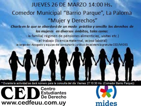 El MIDES y el Centro de Estudiantes de Derecho darán una charla sobre Mujer y derechos en diversos ámbitos tales como la familia (régimen de pensiones alimenticias,, visitas, etc; el trabajo, la licencia maternal y el acoso laboral.