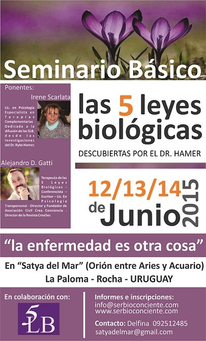 Alejandro Gatti, un especialista en la doctrina de Hamer, dará un seminario en La Paloma y los responsables de Satya del Mar no disimulan el entusiasmo que sienten ante esta oportunidad e invitan a quienes estén interesados en participar a contactarse con ellos a los siguientes teléfonos 092512485  099949439, enviando un mail a serbioconciente.com o [email protected] o bien, presentàndose en la sede de Satya del mar, calle Orión casi Aries de La Paloma. La participación tiene costo y los cupos son limitados.