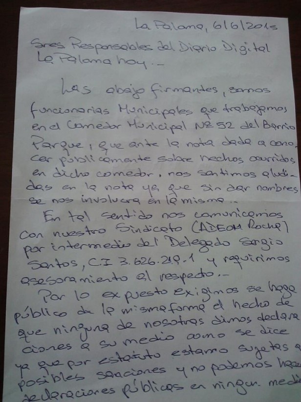 Lo hicieron a través del delegado sindical de ADEOM La paloma, quien acercó a LA PALOMA HOY una declaración manuscrita con la firma de cuatro funcionarias del Comedor Municipal que niegan haber hablado con medios de prensa sobre la situación de dicho establecimiento y que, al mismo tiempo, solicitan que sus nombres no se hagan públicos.