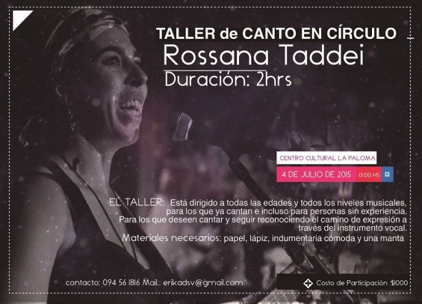 La reconocida cantante Rossana Taddei dirigirá un taller de canto en l Centro Cultural la paloma el próximo 4 de Julio a partir de las 13 hs. la experiencia dura 2 horas y está dirigida a personas con o sin experiencia musical, y de todas las edades.