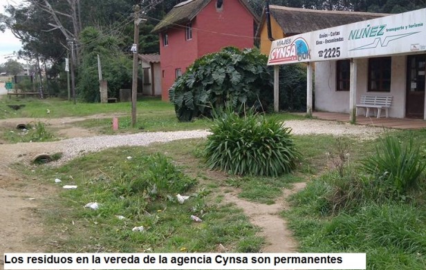 La oficina de la agencia Cynsa de La Pedrera, de la empresa de Transporte Nuñez, sigue generando molestias y dificultades a los vecinos del balneario. No solo provoca inconvenientes en temporada alta, cuando sus vehículos permanecen estacionados, a la espera del horario de salida, frente a casas o en calles de tránsito intenso, a veces con el motor encendido, violando la normativa vigente, sino además durante el resto del año. En este caso se de los residuos que se acumulan en el frente de la agencia tales como bolsas, papeles, envoltorios de golosinas, etc, y que quedan allí a merced del viento y los perros que se encargan de repartirlos por la calle principal. Además, algunos de los choferes tienen la costumbre de barrer los ómnibus y dejar la basura que sacan del interior de los vehículos sobre las veredas de las casas vecinas, empeorando la situación.