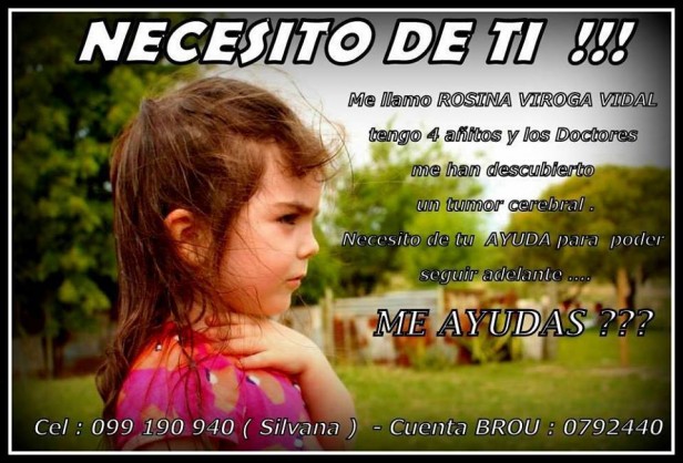 Rosina tiene 4 años y le diagnosticaron un tumor cerebral. La mamá y el papá de Rosina son oriundos de Rocha, pero actualmente viven en Maldonado. La comunidad armó un Facebook desde el cual se coordinan actividades para juntar fondos con el fin de que puedan afrontar los tratamientos necesarios. Éste sábado, por ejemplo, se realiza en el gimnasio de la Paloma a las 19 hs. una actividad de Zumba Fitness con una entrada a 100 pesos, como parte de la campaña de recaudación de fondos. Las actividades son muchas, la gente se está moviendo. Sólo hay que ingresar acá y tratar de ver qué puede hacer cada uno para ayudar a esta familia. Hay una cuenta BROU para colaborar: 0792440.