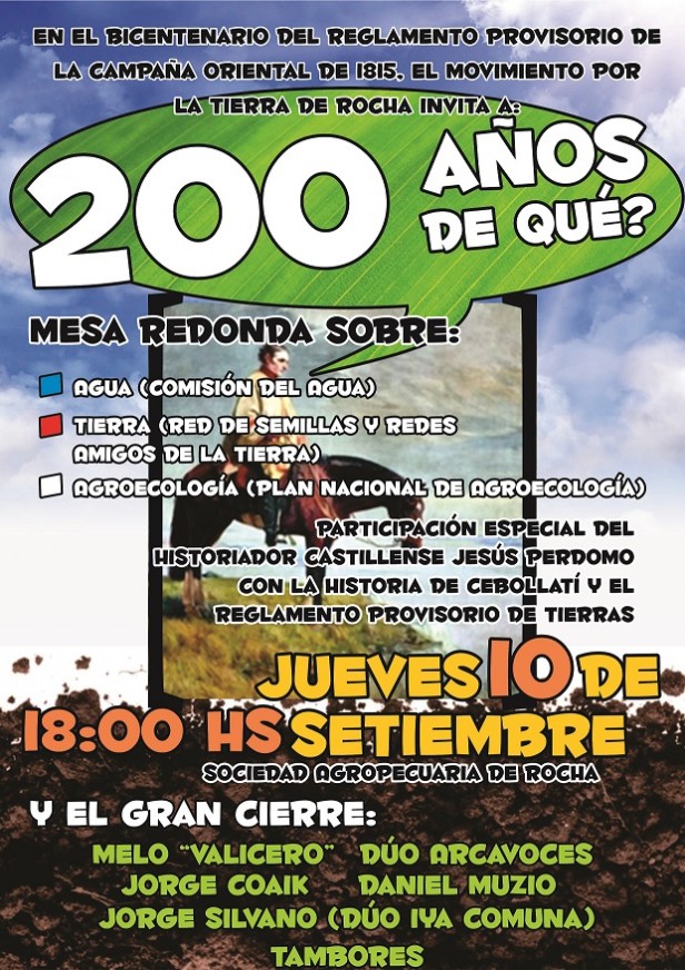 El Movimiento por la Tierra de Rocha llevará a cabo un encuentro en conmemoración del bicentenario de la creación del Reglamento Provisorio para el fomento de la campaña y seguridad de sus hacendados, redactado por Artigas en setiembre de 1815. La actividad tendrá lugar el próximo jueves 10 de septiembre a partir de las 18 hs en la sede de la Sociedad Agrpecuaria de Rocha. Habrá mesas redondas donde especialistas expondrán sobre el Agua y la Tierra. Al finalizar, se llevará a cabo un espectáculo con músicos en vivo en el que se presentarán Werther "Melo" Blanco y Jorge Coaik... de Valizas; Daniel Muzio, Jorge Silvano (Yya Comuna), Arcavoces, y para el final los Tambores.