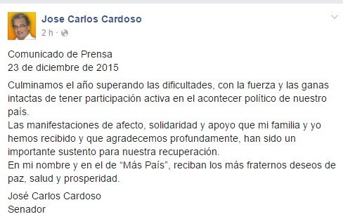 Fue a través de un comunicado de prensa difundido en su Facebook en el que agradece: "Las manifestaciones de afecto, solidaridad y apoyo que mi familia y yo hemos recibido". El senador nacionalista había sufrido un accidente el pasado 8 de Noviembre en la ruta 10, cerca de Valizas.